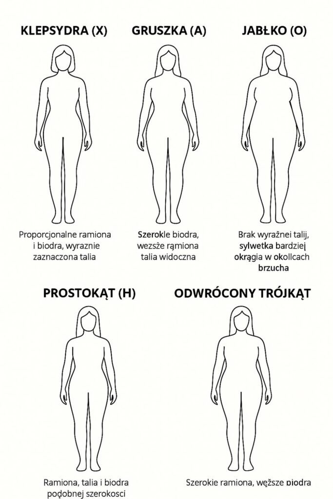 | Jabłko (O) | Mniej zaznaczona talia, pełniejszy tułów. | Zaokrąglony obszar brzucha, smuklejsze nogi. | Proste tuniki, sukienki o kroju A, fasony wysmuklające. |