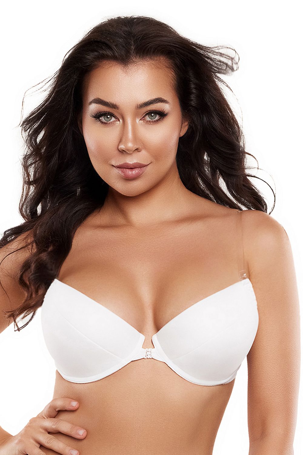 Biustonosz 5770 to elegancki biały stanik z silikonowym, przezroczystym tyłem. Jest doskonały pod dopasowane sukienki z odsłoniętymi plecami. Biustonosz jest wyposażony w wyjmowane wkładki push-up oraz odpinane silikonowe ramiączka.