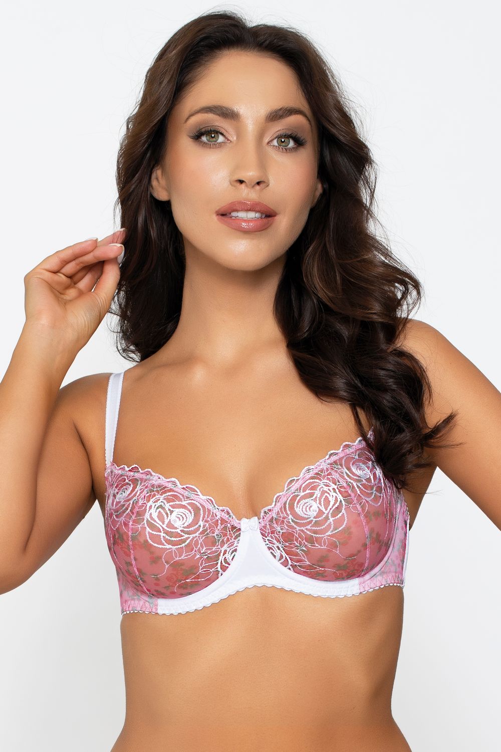Biustonosz Fiori to uroczy stanik, którego miseczki wykonane są z delikatnej drukowanej siateczki pokrytej haftem. Siateczka w odcieniu delikatnego różu stanowi doskonałe tło dla białego, kwiatowego haftu. Ramiączka regulowane, nieodpinane. Boczki i tył białe. Ma trzystopniowe zapięcie na haftki.