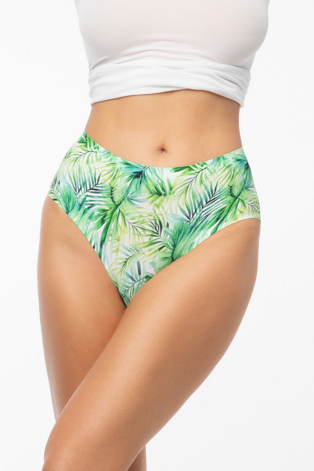 Brazyliany Exotico maxi to bezszwowe majtki damskie. Są wykonane z miękkiej i elastycznej, drukowanej dzianiny. Soczysta zieleń liści na delikatnym tle tętni życiem i świeżością – jak tropikalny ogród. Precyzyjne laserowe cięcie i i brak szyć, sprawiają, że majteczki są praktycznie niewidoczne pod ubraniem. Bawełniana wkładka dba o higienę intymną.