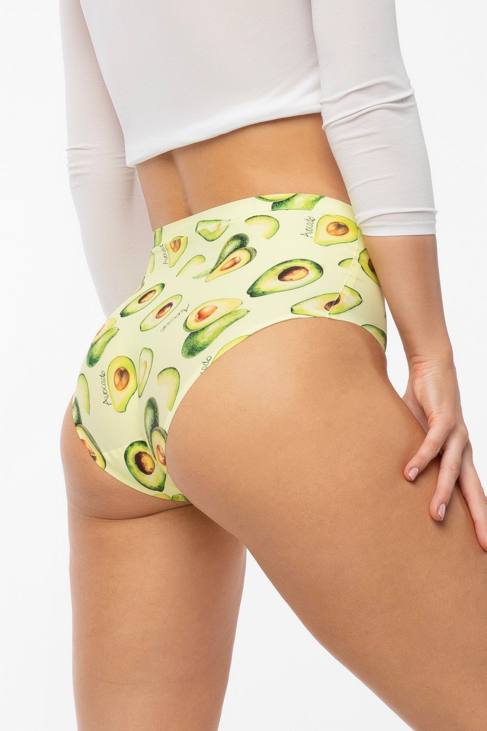 Figi Avocado maxi to bezszwowe majtki damskie. Są wykonane z miękkiej i elastycznej, drukowanej dzianiny- owocowy motyw w modnej zieleni. Precyzyjne laserowe cięcie i i brak szyć, sprawiają, że majteczki są praktycznie niewidoczne pod ubraniem. Bawełniana wkładka dba o higienę intymną.