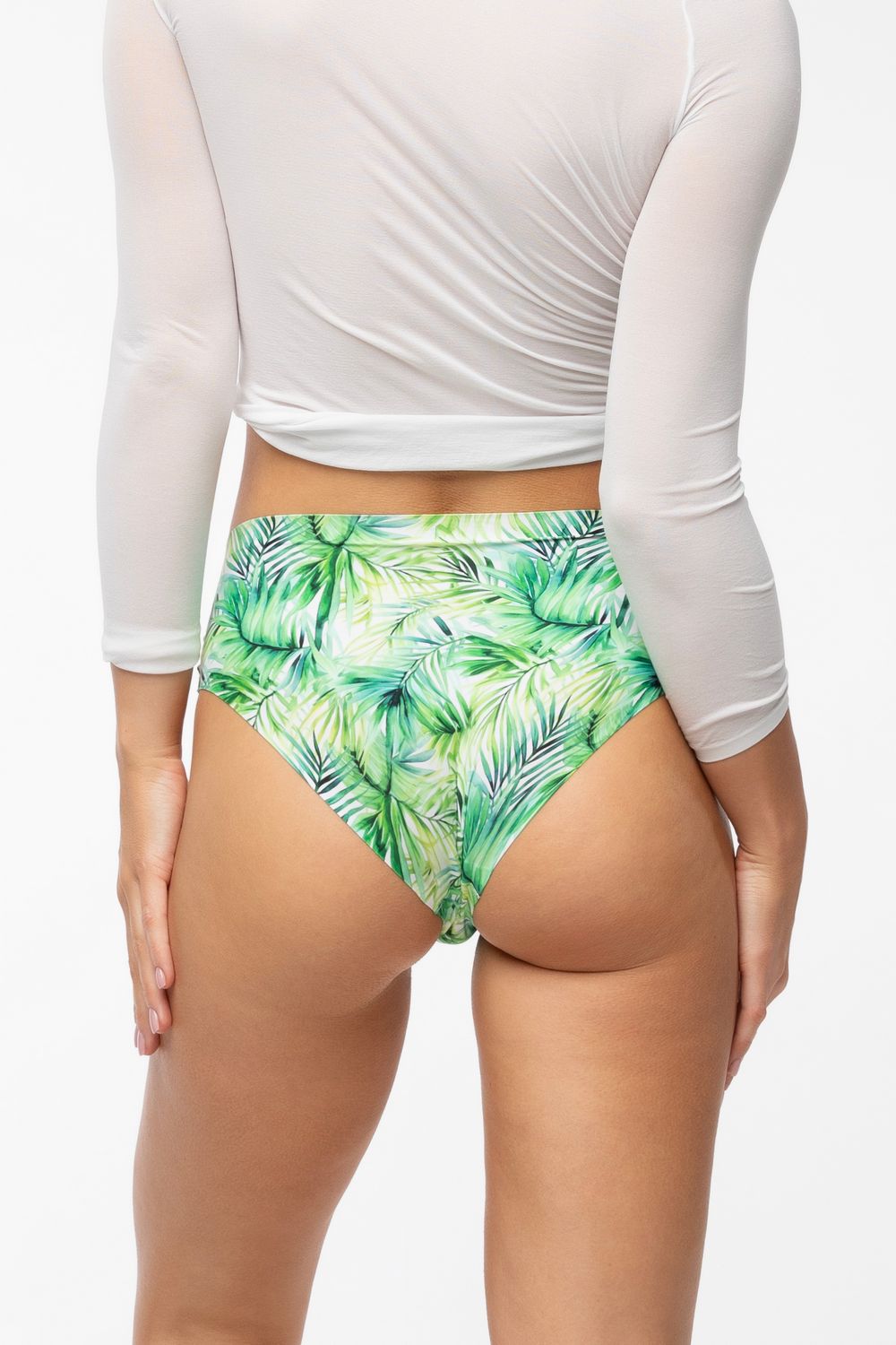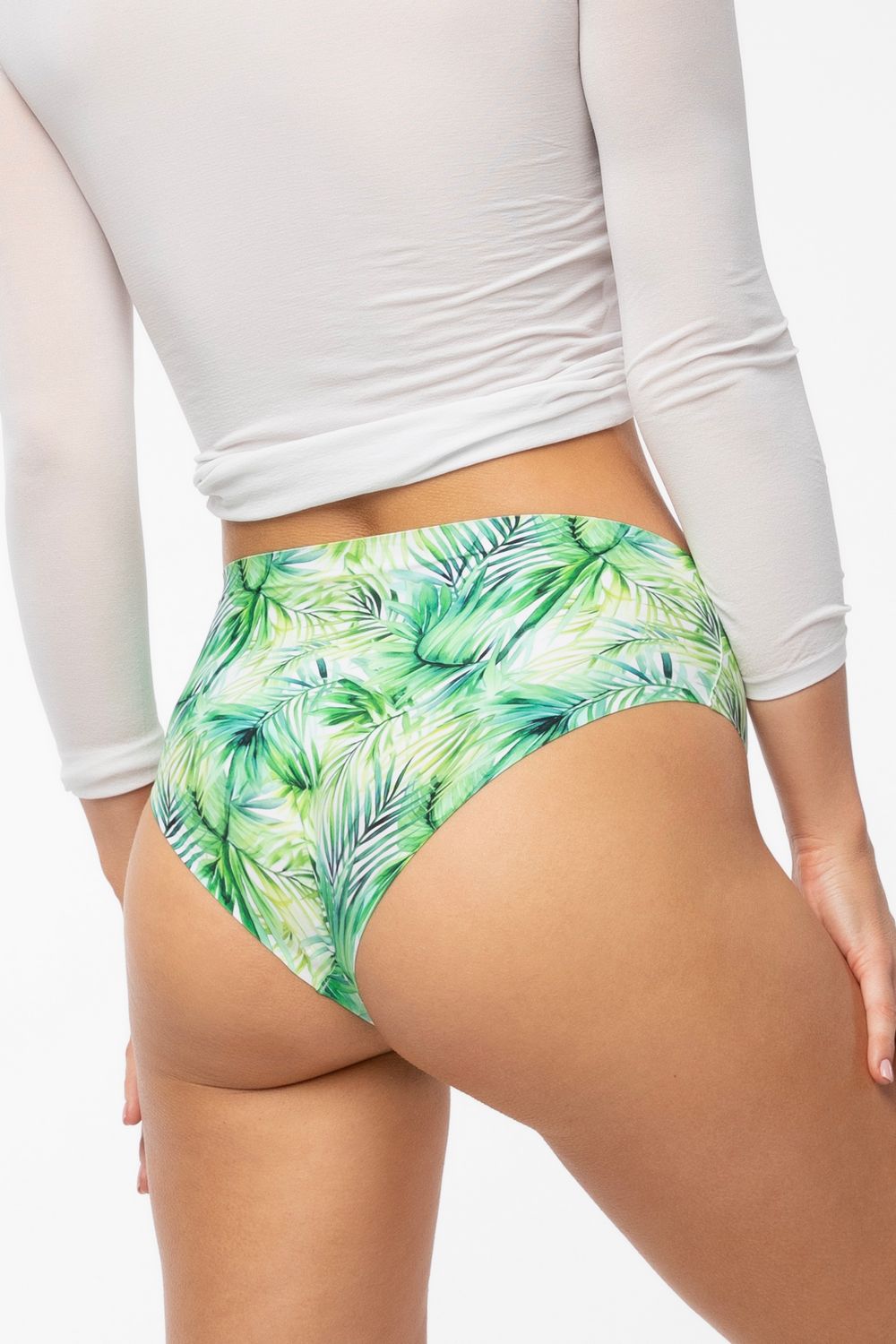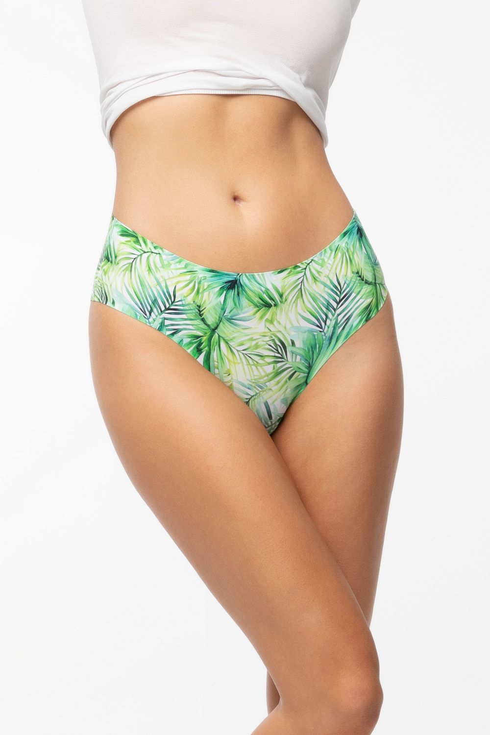 Figi Exotico to bezszwowe majtki damskie. Są wykonane z miękkiej i elastycznej, drukowanej dzianiny. Soczysta zieleń liści na delikatnym tle tętni życiem i świeżością – jak tropikalny ogród. Precyzyjne laserowe cięcie i i brak szyć, sprawiają, że majteczki są praktycznie niewidoczne pod ubraniem. Bawełniana wkładka dba o higienę intymną.