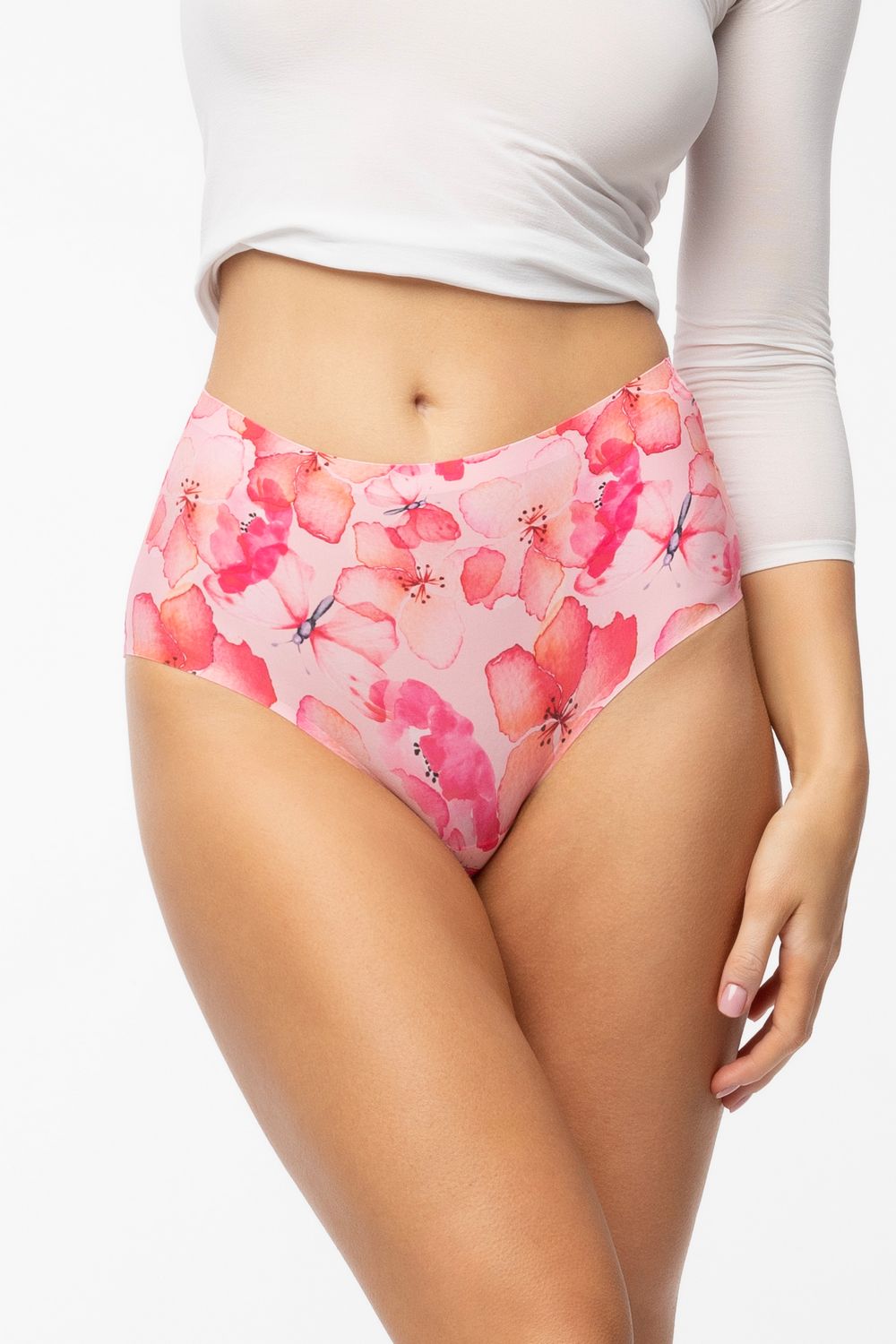 Figi Mallow maxi to bezszwowe majtki damskie z wysokim stanem Są wykonane z miękkiej i elastycznej dzianiny, drukowanej wzorem inspirowanym kwiatem malwy. Wiosennego wyglądu nadaje im pastelowa kolorystyka w odcieniach różu i fuksji i subtelny, akwarelowy charakter nadruku. Bawełniana wkładka dba o higienę intymną, a klejone wykończenia ograniczają widoczność pod odzieżą. Zastosowano hot stamping zamiast metki dla osób z wysoką wrażliwością sensoryczną.