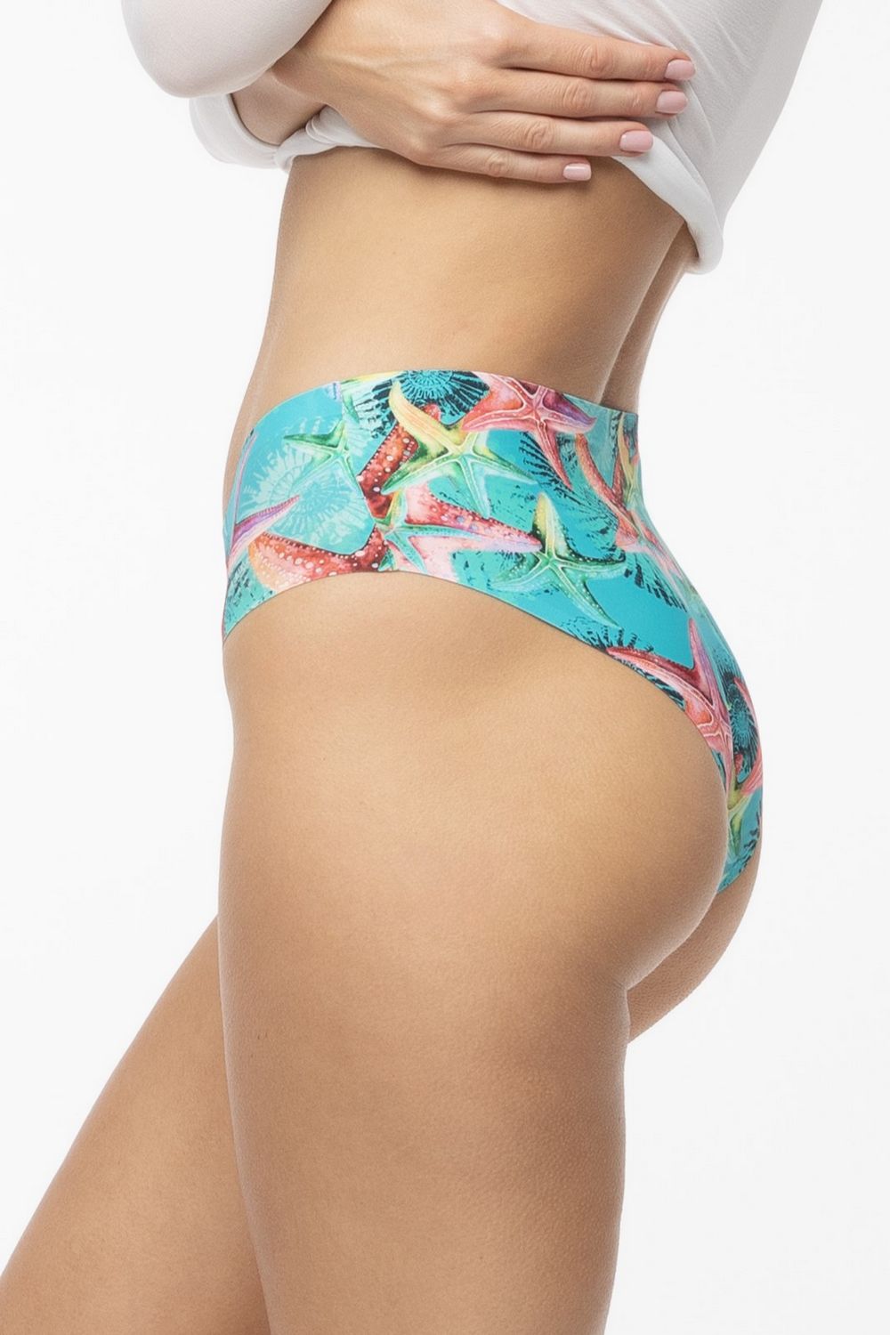 Figi Sea Stars to bezszwowe majtki damskie. Są wykonane z miękkiej i elastycznej, drukowanej dzianiny, a wzór to czysta radość zaklęta w tropikalnych barwach i morskich kształtach. Soczyste rozgwiazdy w odcieniach różu, pomarańczy i limonki rozkwitają na turkusowym tle. Precyzyjne laserowe cięcie i i brak szyć, sprawiają, że majteczki są praktycznie niewidoczne pod ubraniem. Bawełniana wkładka dba o higienę intymną.