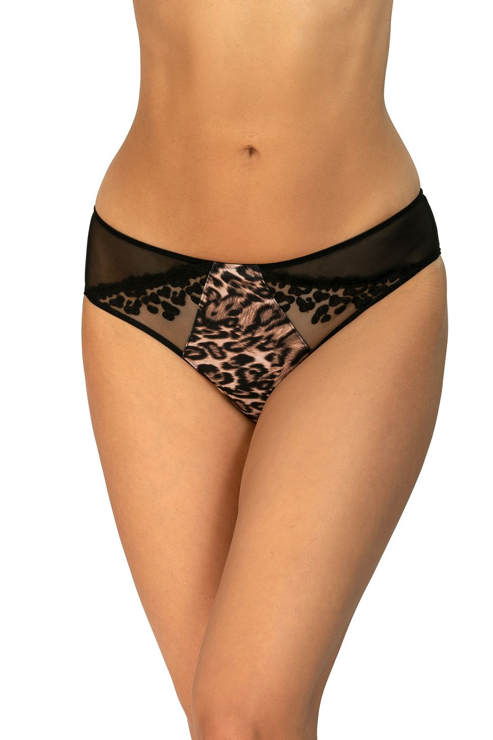 Figi Vaiana to intrygujące majteczki ze zwierzęcym printem. Przód z transparentnej dzianiny zdobi wstawka z leopardowym wzorem. Tył gładki.