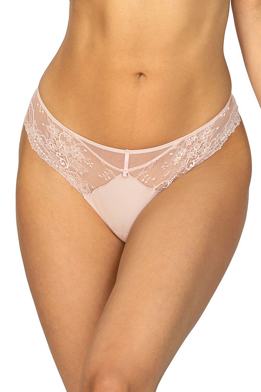 Stringi Alisha to intrygujące majteczki w kolorze pudrowego różu. Na koronkowym przodzie wszyto gładką wstawkę z dzianiny. Tył z dzianiny zdobi delikatna koronkowa wstawka pod gumką.