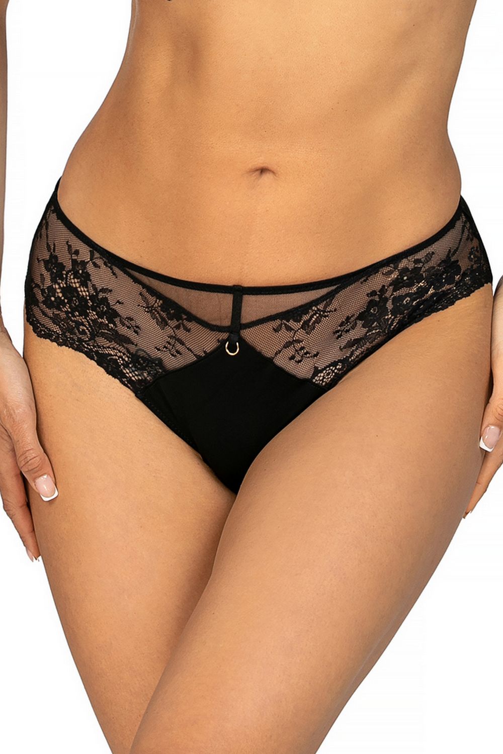 Stringi Alisha to intrygujące czarne majteczki. Na koronkowym przodzie wszyto wstawkę z czarnej dzianiny. Tył z dzianiny zdobi delikatna koronkowa wstawka pod gumką.