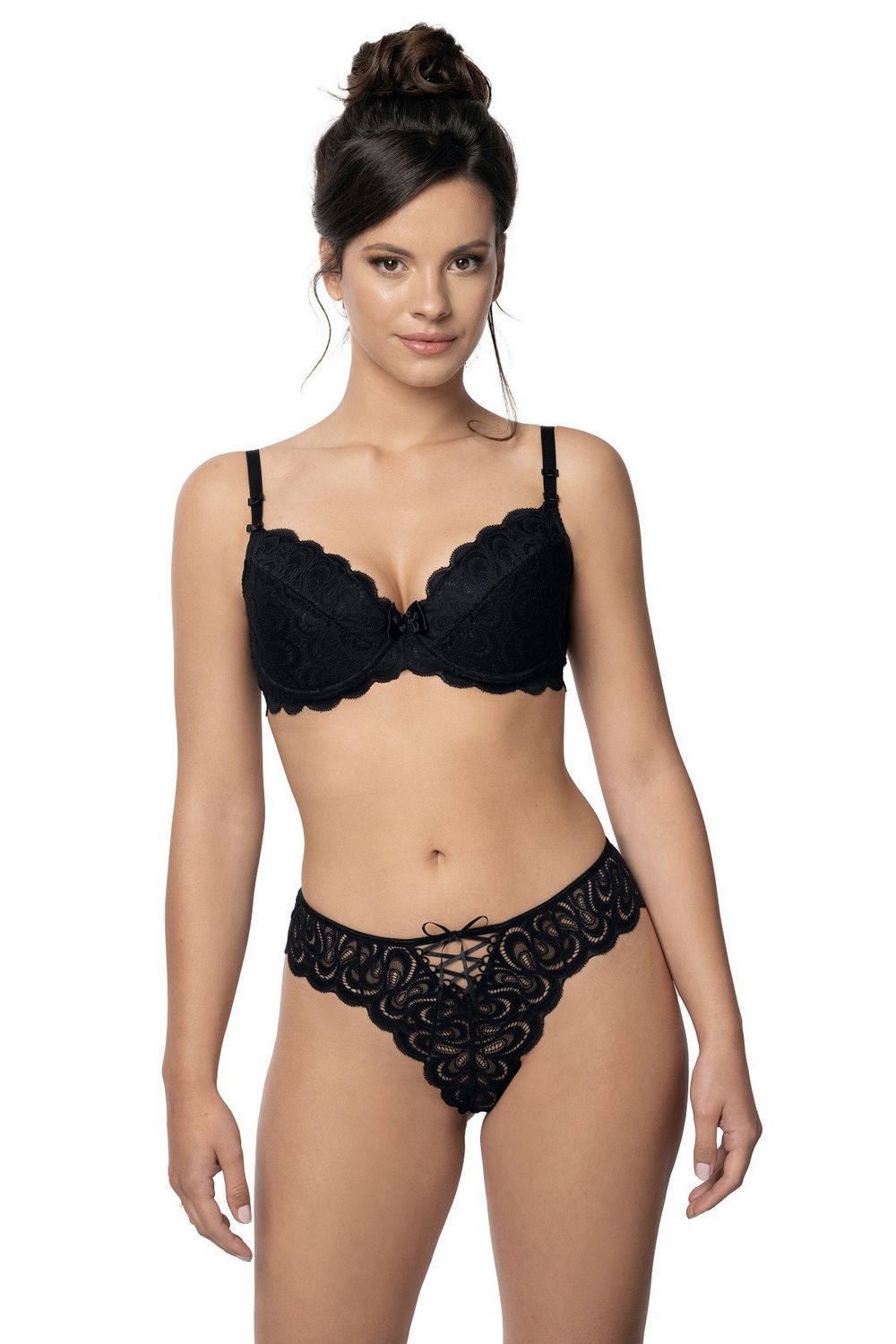 Stringi Termena to majteczki wykonane z eleganckiej koronki. Z przodu znajdują się ozdobne sznurowania, które dodają całości odrobinę pikanterii i przyciągają wzrok.