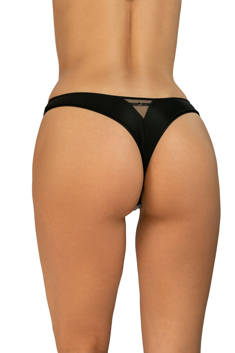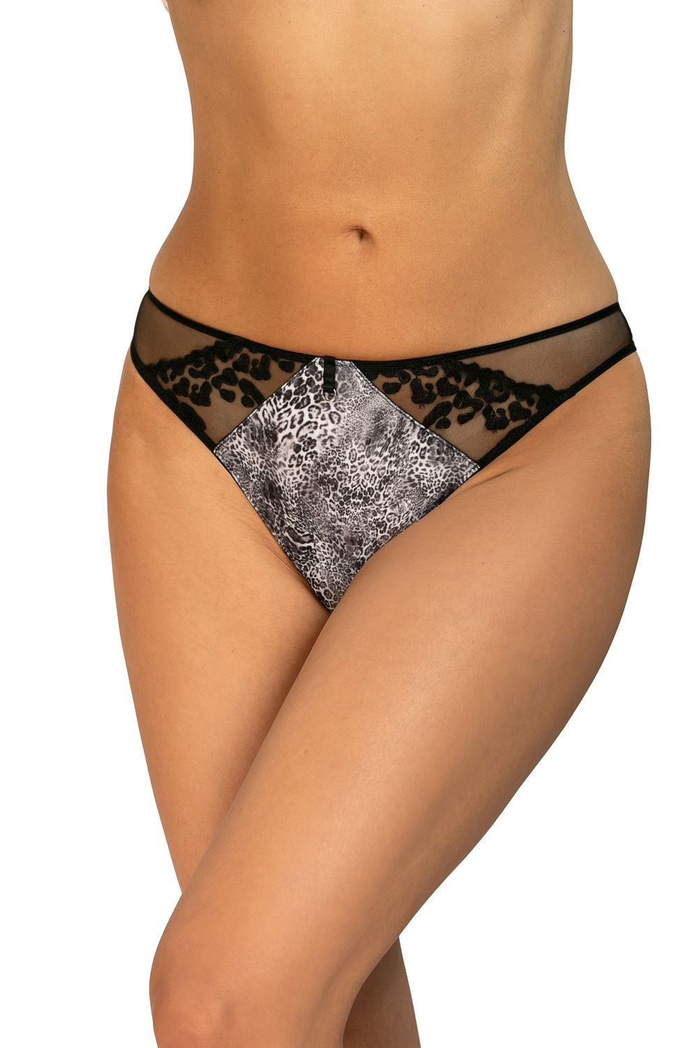 Stringi Zahara to intrygujące majteczki ze zwierzęcym printem. Przód z transparentnej dzianiny zdobi wstawka z szarym, leopardowym wzorem. Tył z ozdobną, transparentną wstawką pod gumką.